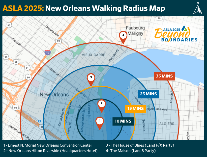 ASLA wants to help maximize your enjoyment and experience of New Orleans at this year's conference! The Plan Your Trip pages offer tips to reduce travel emissions and costs, local picks from the Louisiana Chapter, and guidance for getting around—from airport arrivals to walking between hotels and the convention center.
